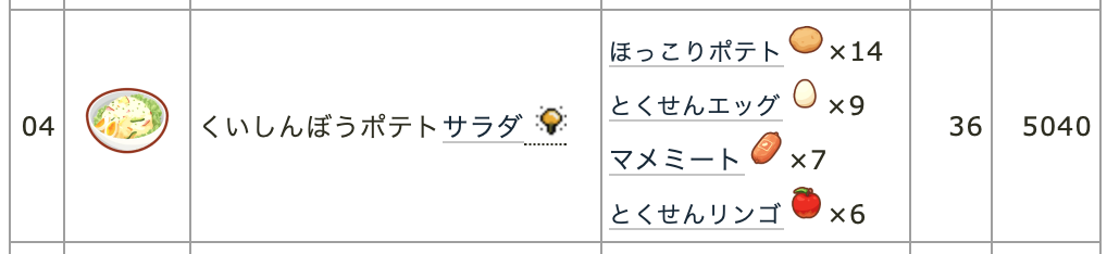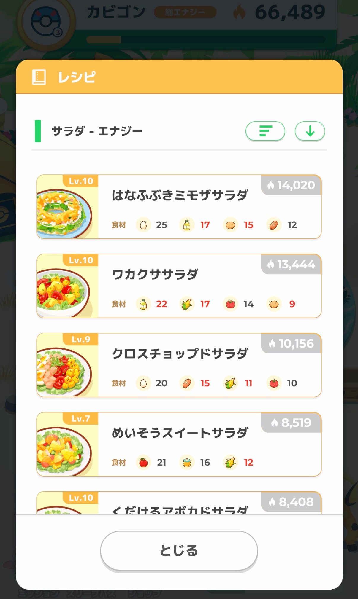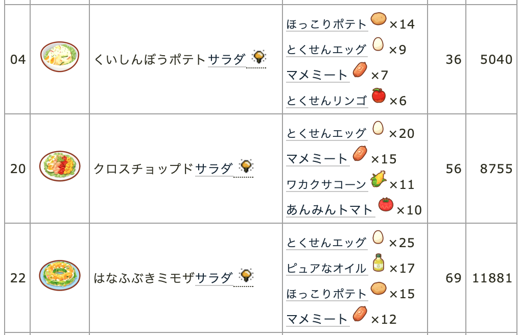 狙いは以下の3レシピですかね。タマゴは固定編成のハピナスが持ってくるのでなんとかなりそうです。