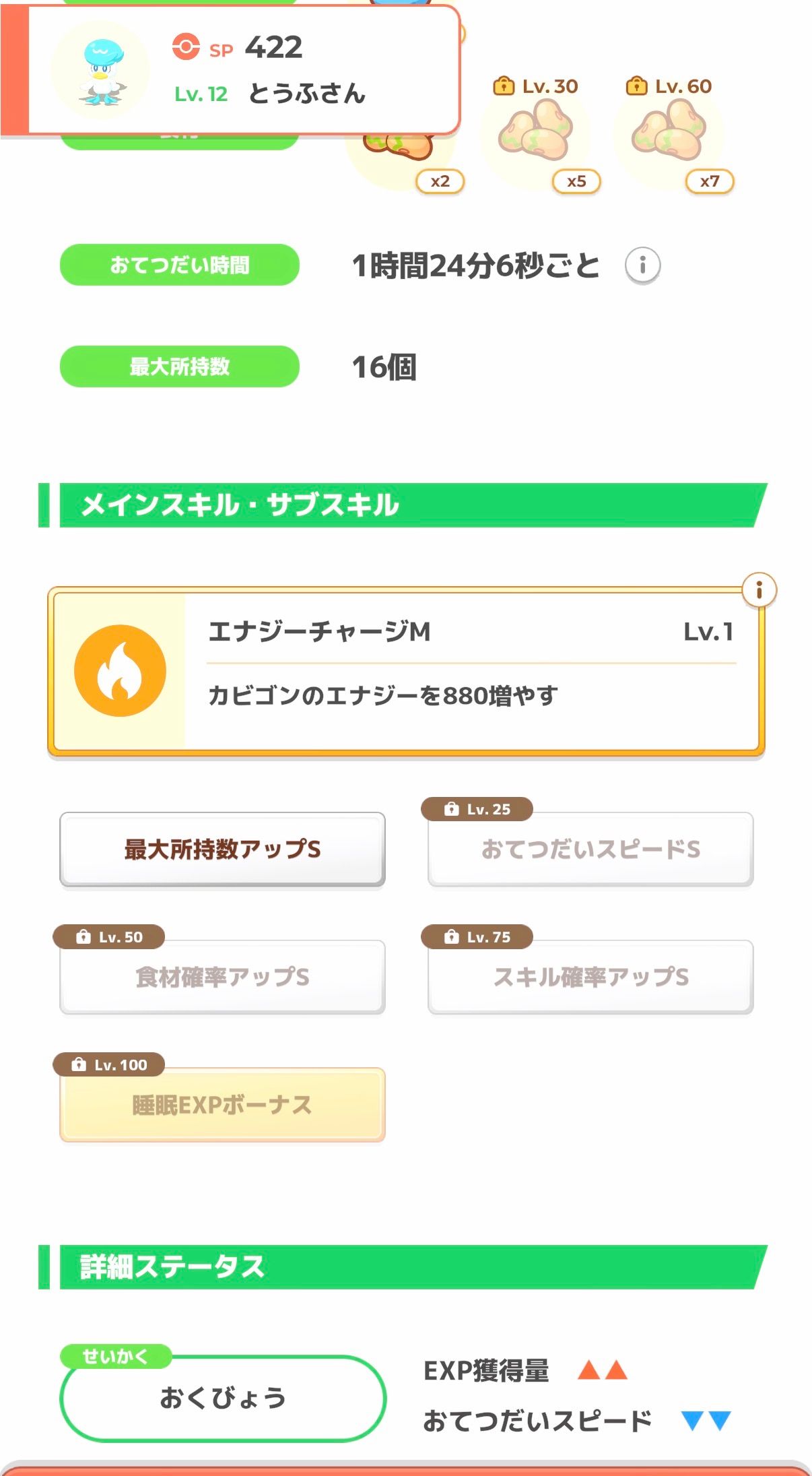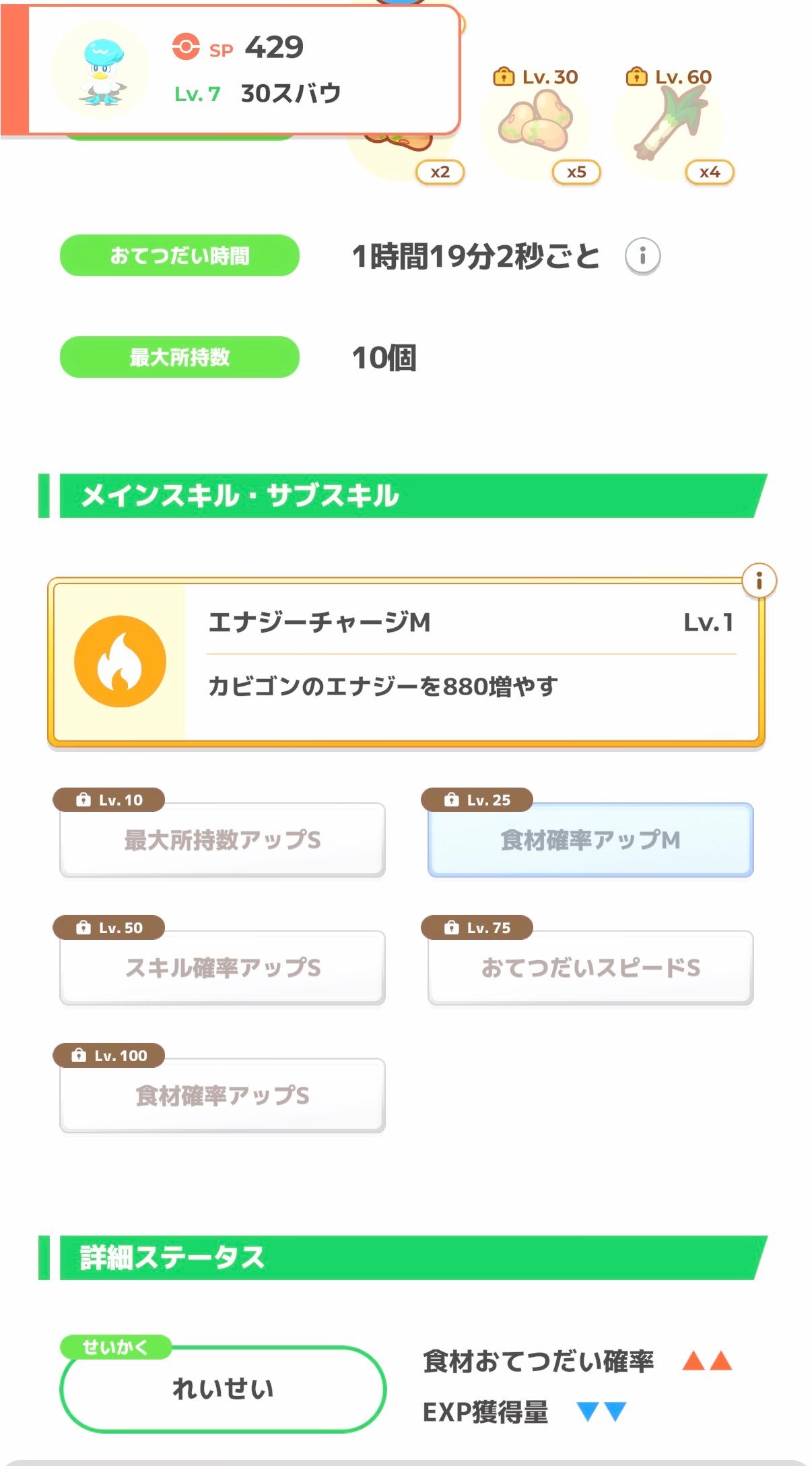 Lv30で2補正+所持s持ちの以下の個体がすでに加入済みで、どっちを育てるか迷っています。こちらの方が断然コスパ良く働いてくれるんですよねー。