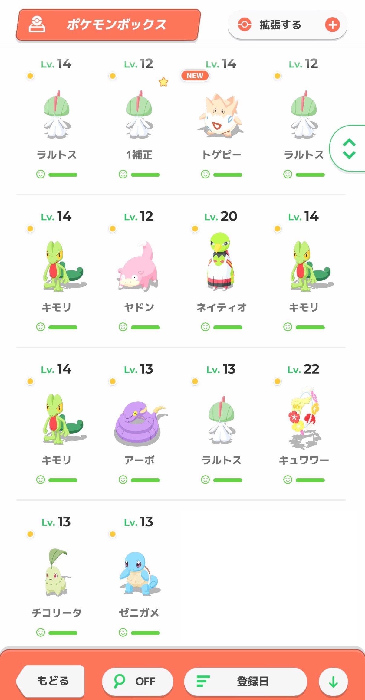 今週は14匹捕まえました。お目当てのラルトスは4体、キモリは3体ですね。